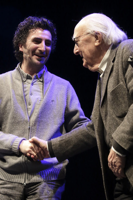 Pau Vidal a casa d’Andrea Camilleri amb el premi del festival «El vi fa sang» (Roma, abril de 2015). -